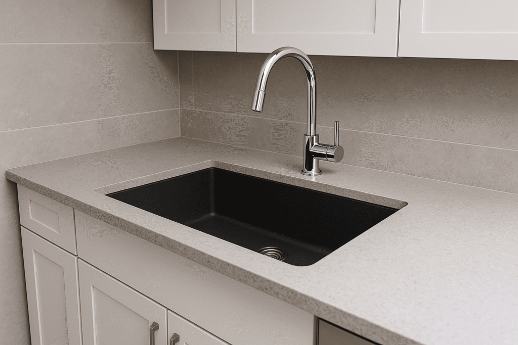 Overhead kitchen shot with quartz sink in Pebble Grey; light bouncing off subtle stone flecks.